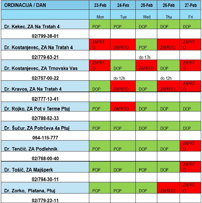 ZOBNA AMBULANTA MARKOVCI, MATEJA JAGARINEC MILKOVIČ, DR. DENT. MED. MED 23. 2. IN 27.2.2026 NE DELA ZARADI LETNEGA DOPUSTA. Z DELOM PRIČNEMO 2.3.2026. V PRIMERU BOLEČIN SE OBRNITE NA ZOBOZDRAVNIKE KONCESIONARJE PO SPODNJEM SEZNAMU. OB SOBOTAH, NEDELJAH IN PRAZNIKIH JE DEŽURNA AMBULANTA V ZD PTUJ OD 8:00 DO 12:00.
